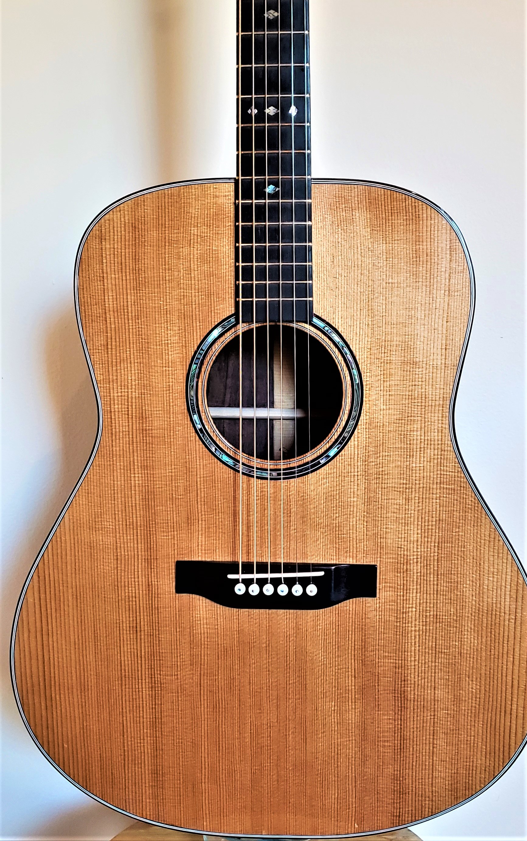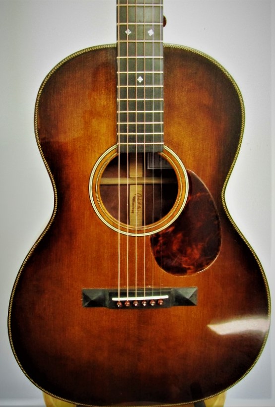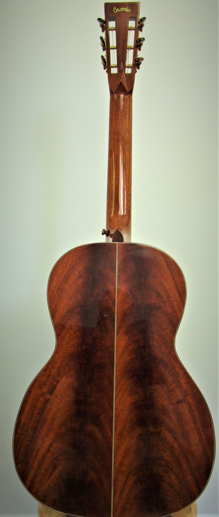 Spectacular crotch grain Mahogany for the back. Herringbone purfling around the top, which is shaded in the old style of early Gibson instruments. The color is applied to the raw wood, rather than being in the nitro lacquer finish coats as mos shading has been done since the 1930s.