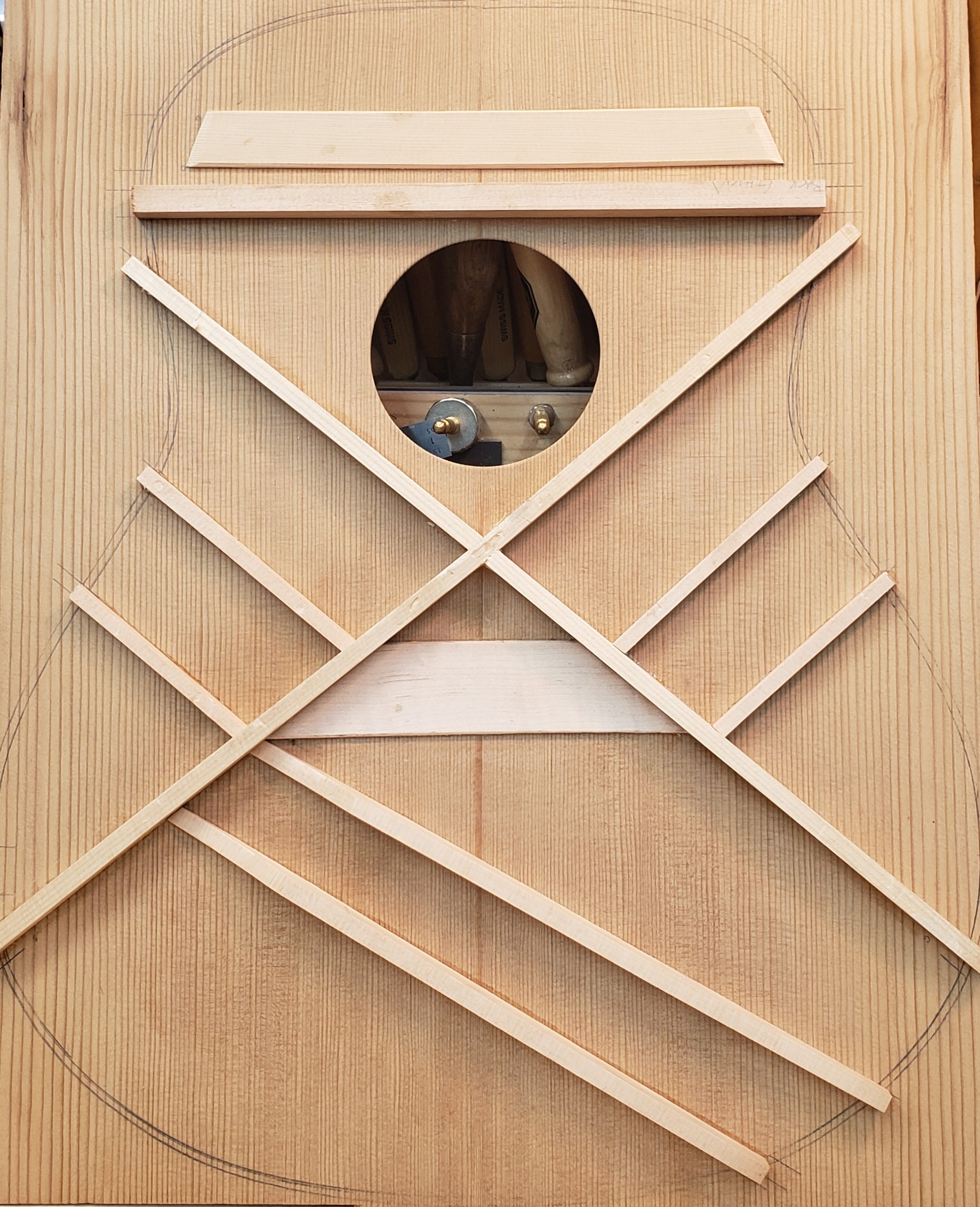 This is the bracing pattern before carving the braces and voicing the top. Braces are not yet scalloped or trimmed to final size.